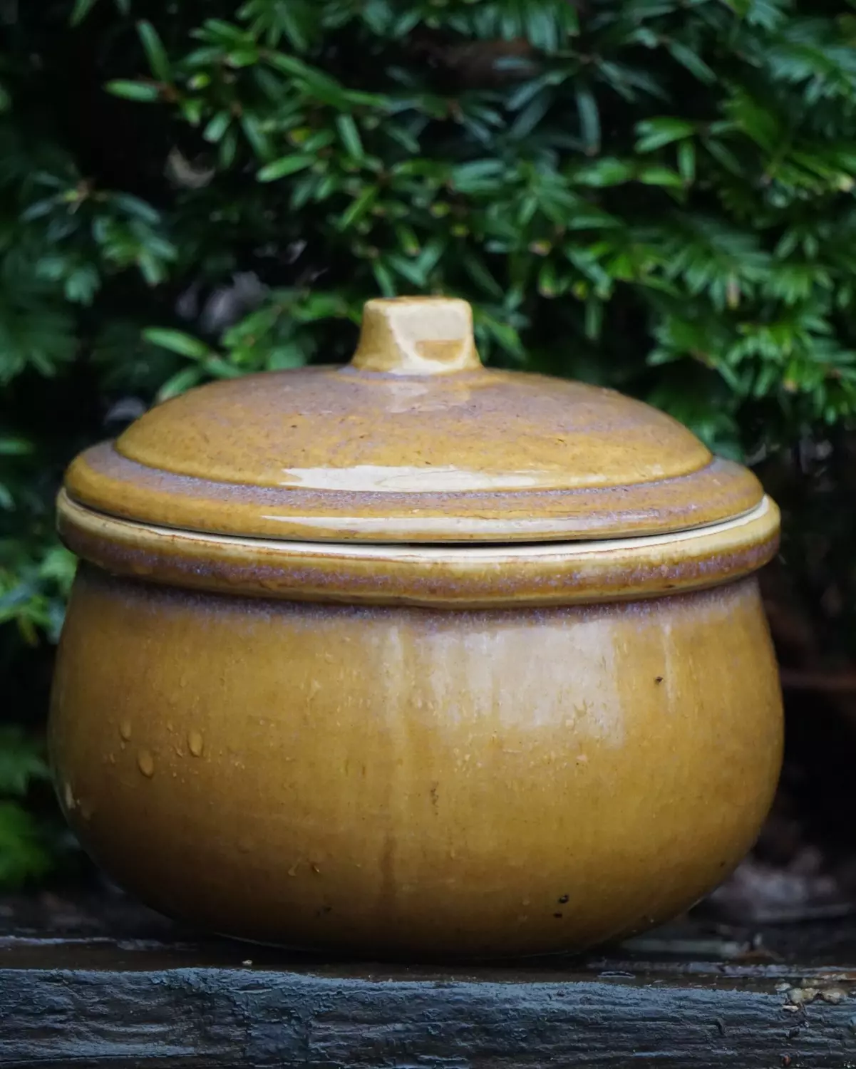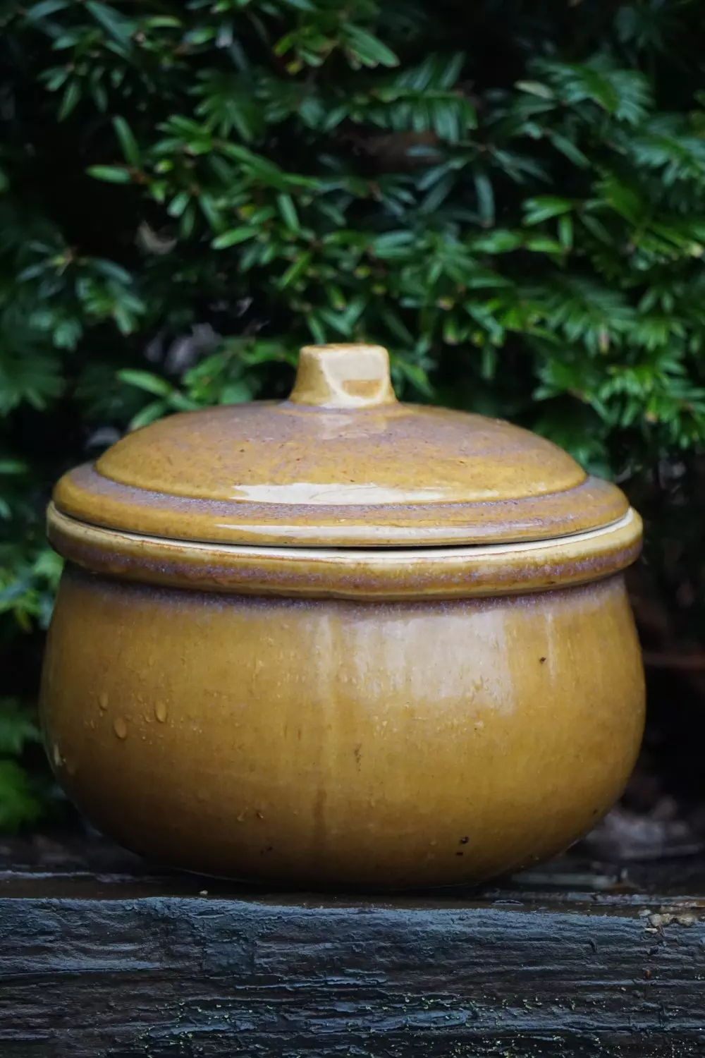 En sjarmerende liten krukke i varm curryfarge som gir et friskt innslag til interiøret. Laget i keramikk med lokk – perfekt til oppbevaring av småting, krydder eller som dekorativt element på kjøkkenet eller badet.