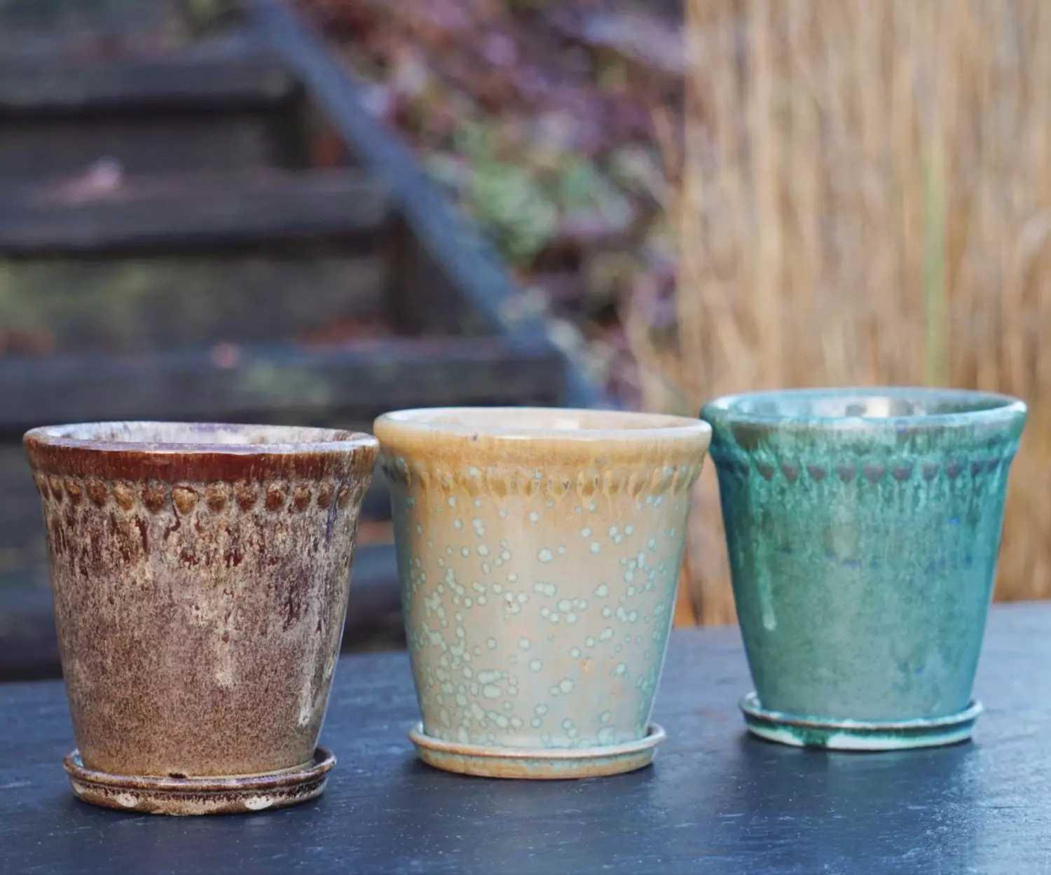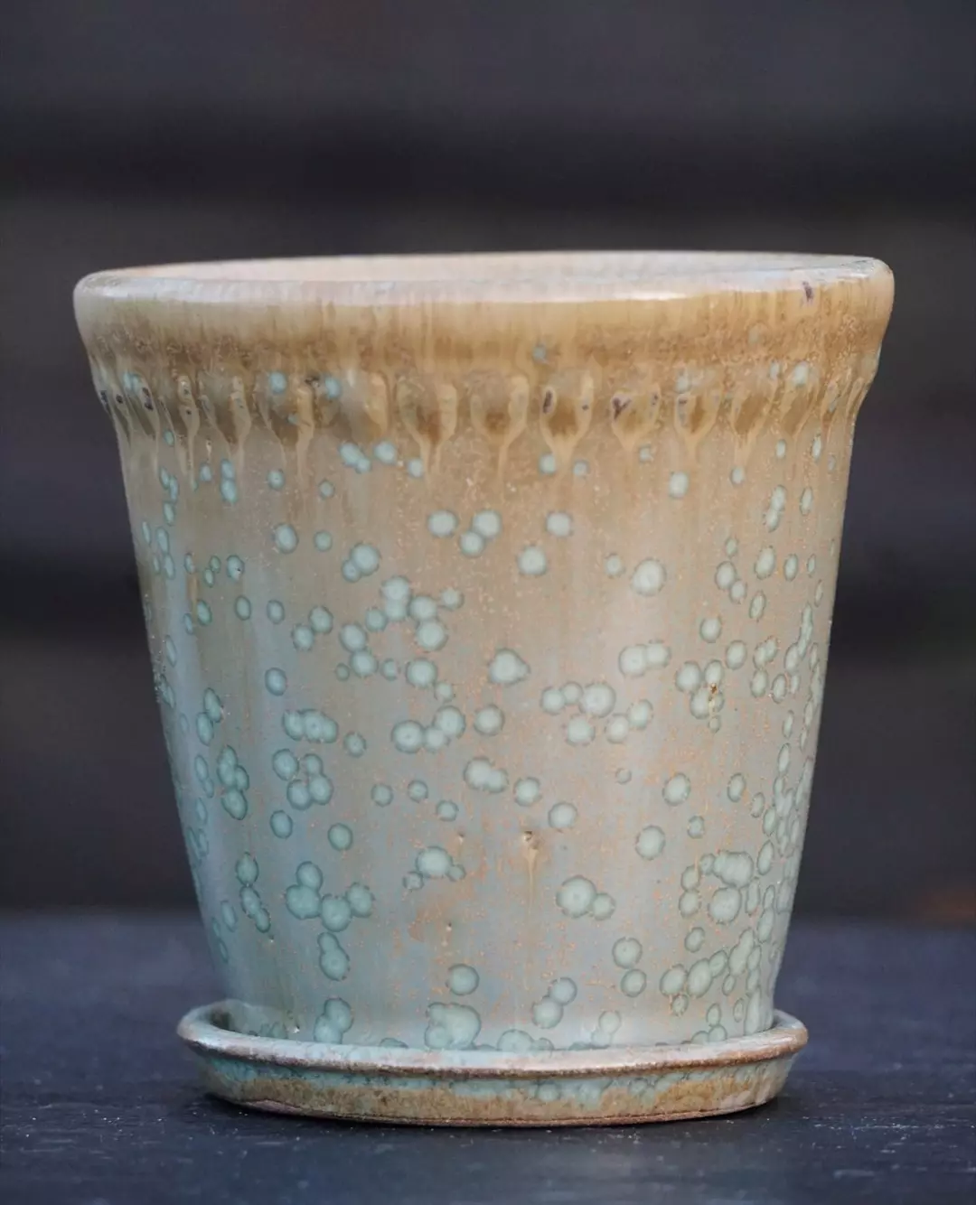 En dekorativ blomsterpotte i glasert keramikk med en varm gulbeige tone og et unikt mønster i overflaten. Potten måler 10 x 10 cm – perfekt til små grønne planter, urter eller stiklinger.
