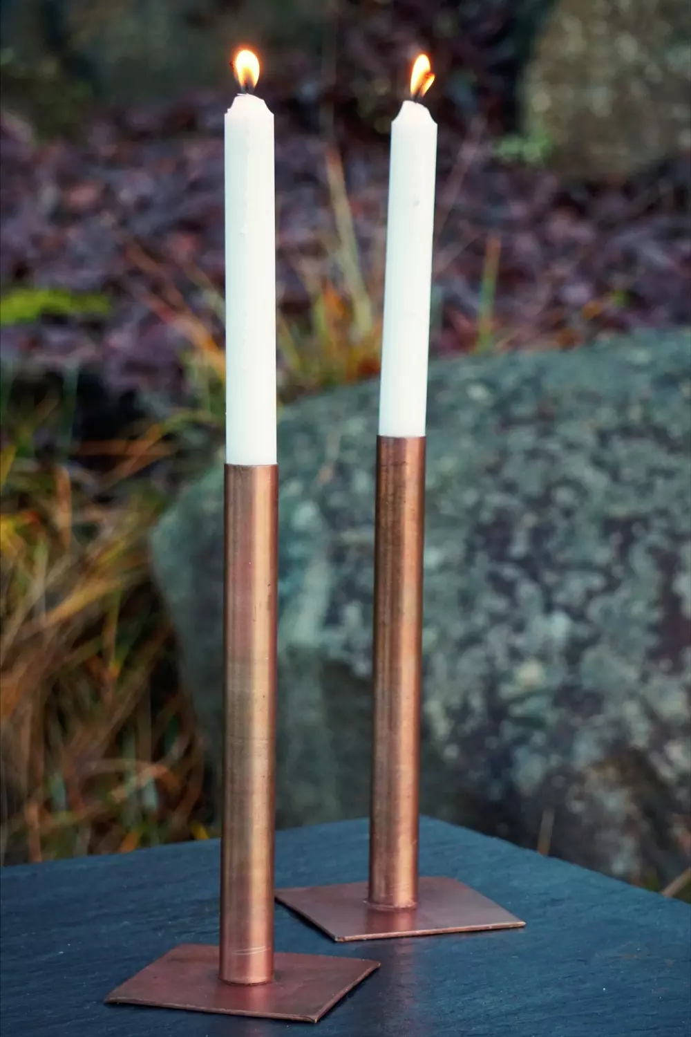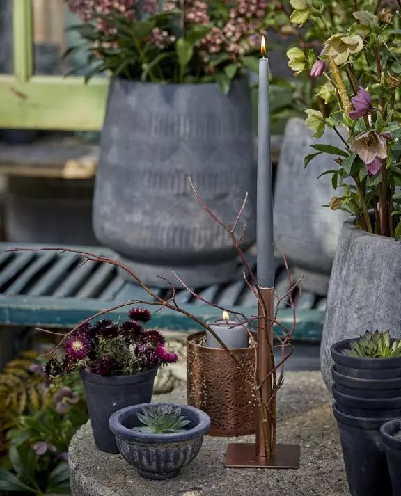 Det slanke, smale designet i kobber gir et lett og elegant uttrykk, og lyset plasseres enkelt ned i røret.
