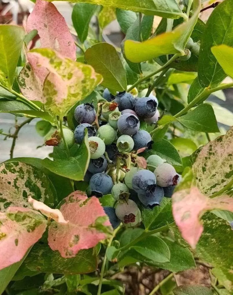 ‘Flamingo’ er en brokebladet blåbærsort med mellomstore blåsorte bær – søt, litt syrlig smak.